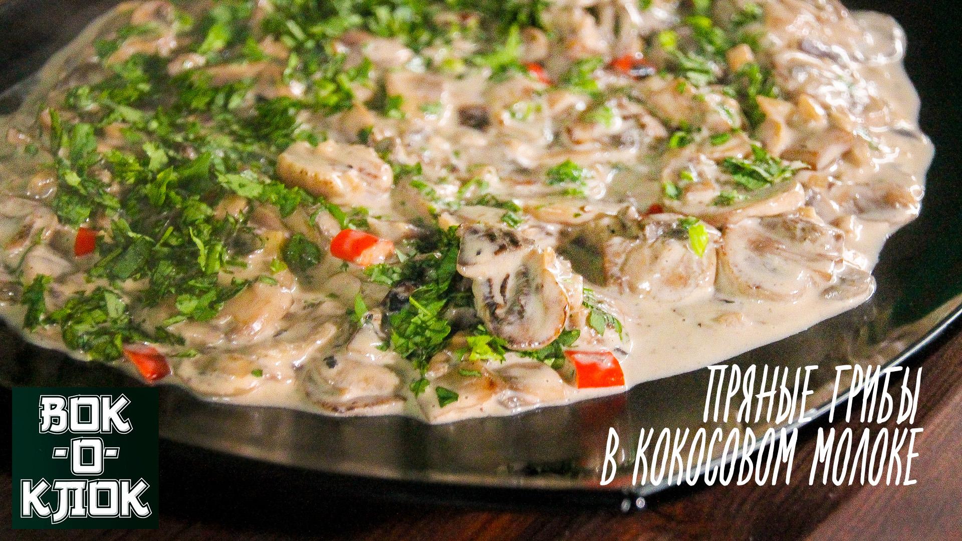 Вливаем кокосовое молоко, доводим до кипения и готовим пока из молока не испарится лишняя влага и оно не начнёт обволакивать грибы. После этого, если нужно – солим.
