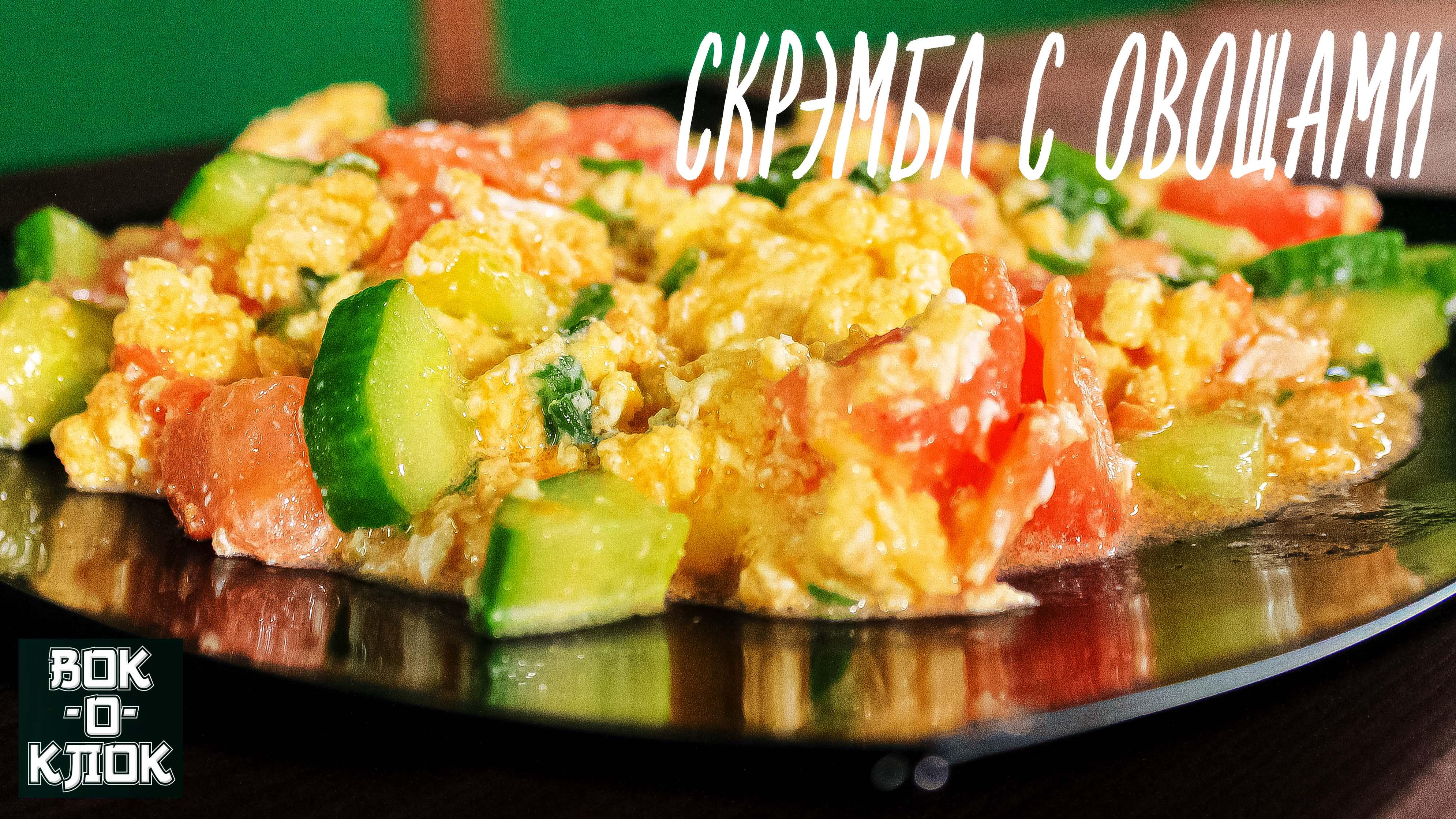 Достаём яичницу из вока, добавляем оставшееся масло, увеличиваем огонь, добавляем в вок овощи и обжариваем при постоянном помешивании одну минуту. Можно посолить.