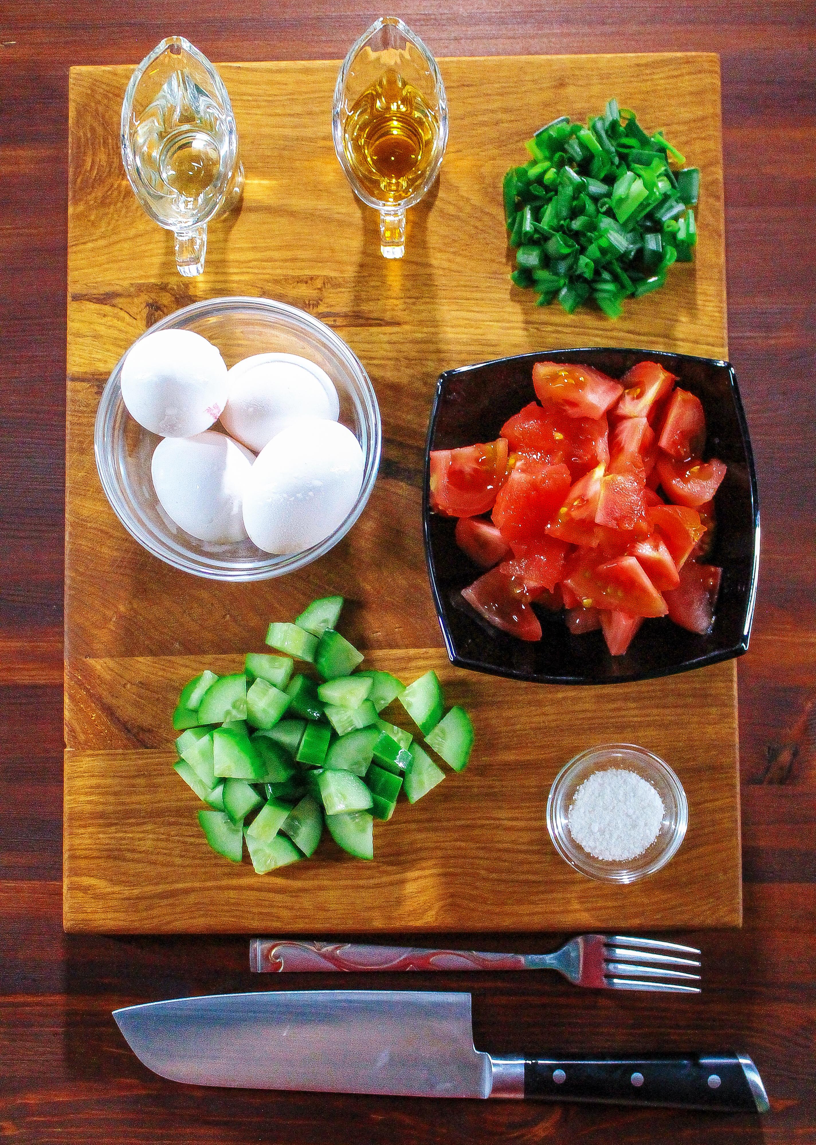 Начнём мы с того, что взобьём яйца с солью и зелёным луком в отдельной ёмкости.