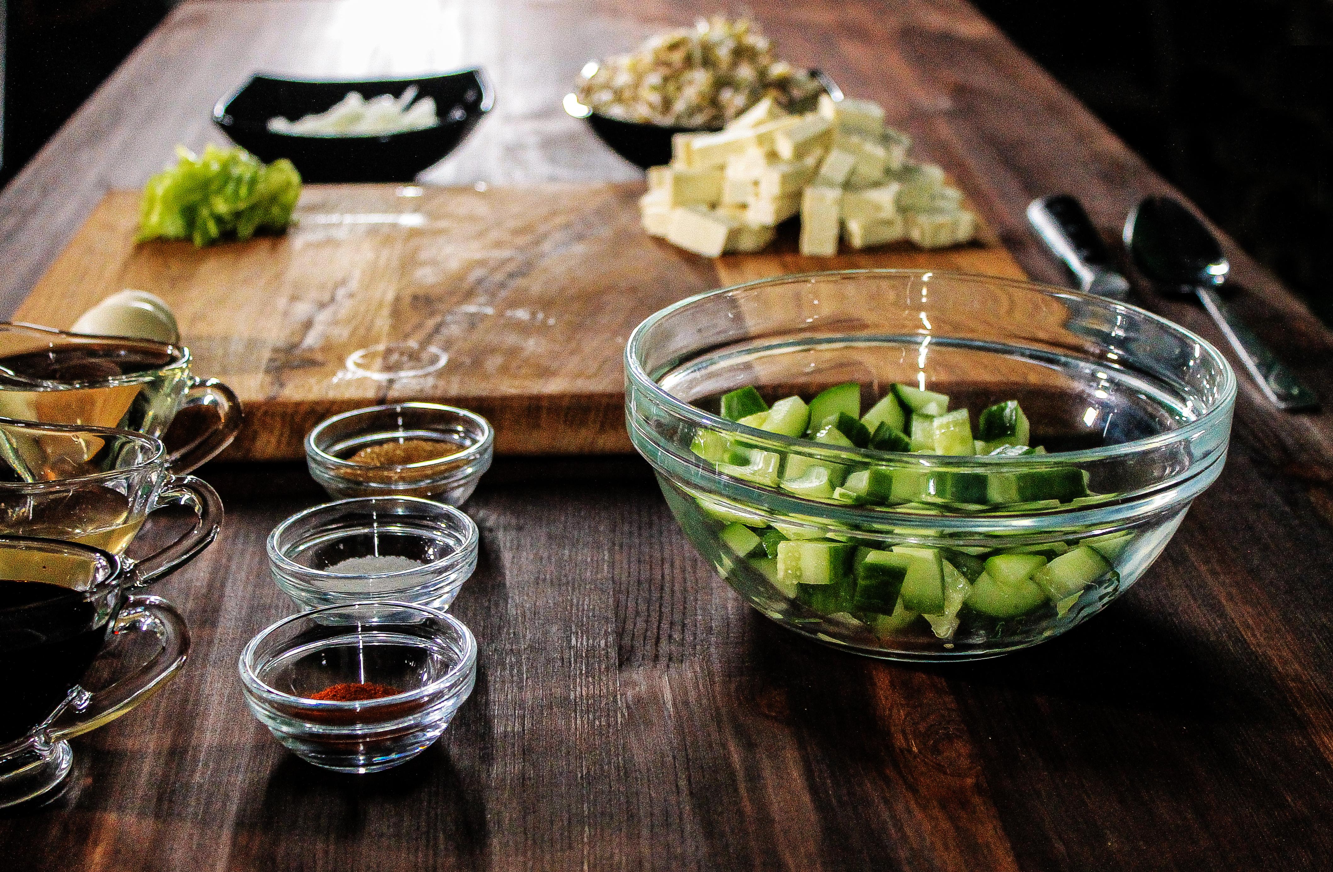 Непосредственно перед подачей промываем огурец холодной водой, чтобы он не был слишком солёным и смешиваем вместе огурец, тофу, проростки, поливаем сверху соусом и опционально украшаем сельдереем.