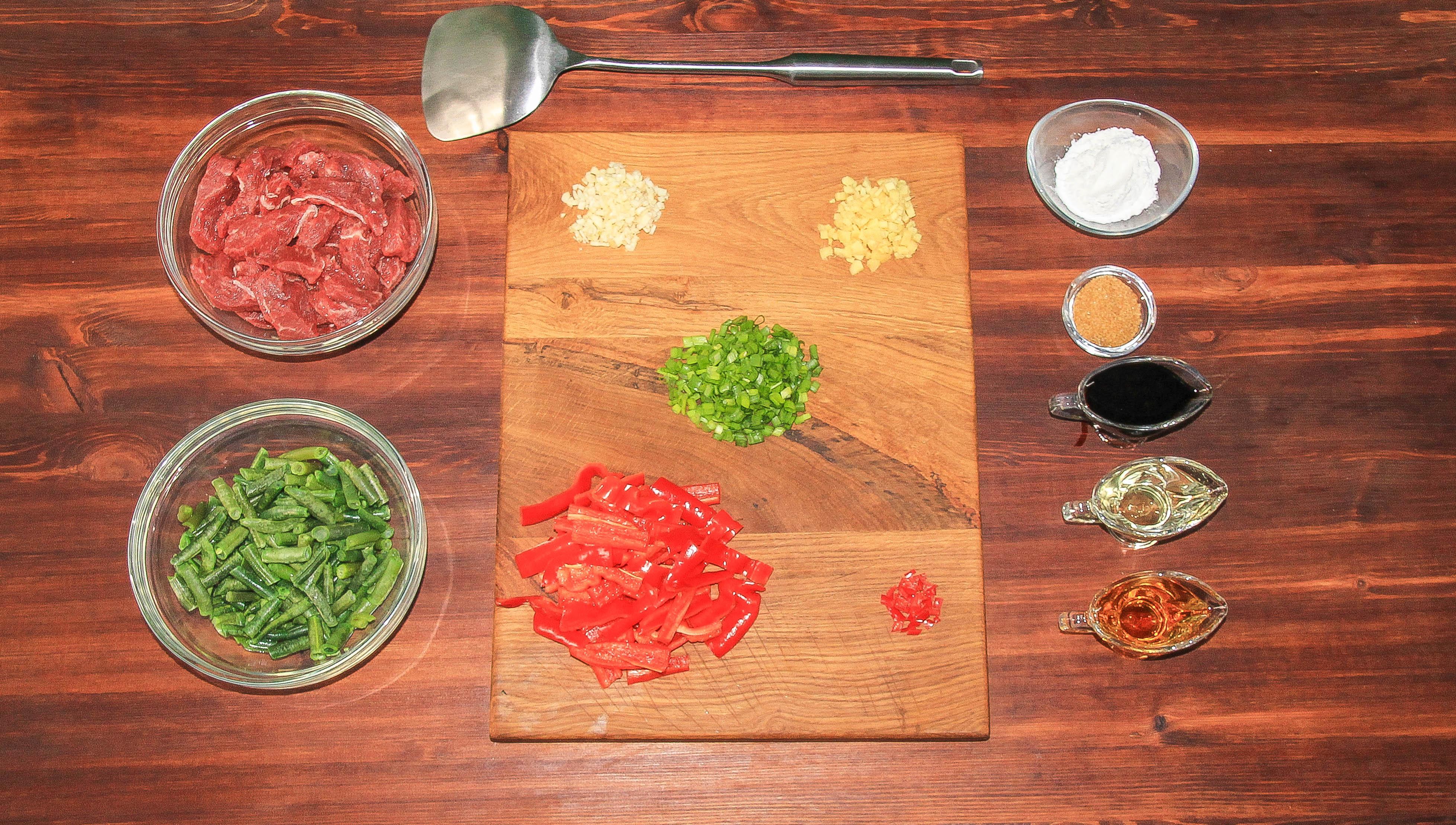 30 минут прошло и мы наконец то можем нагреть вок и смазать его маслом! Обжариваем имбирь с чесноком 30 секунд, после чего добавляем перец, фасоль, чили, половину лука и обжариваем ещё 3 минуты.