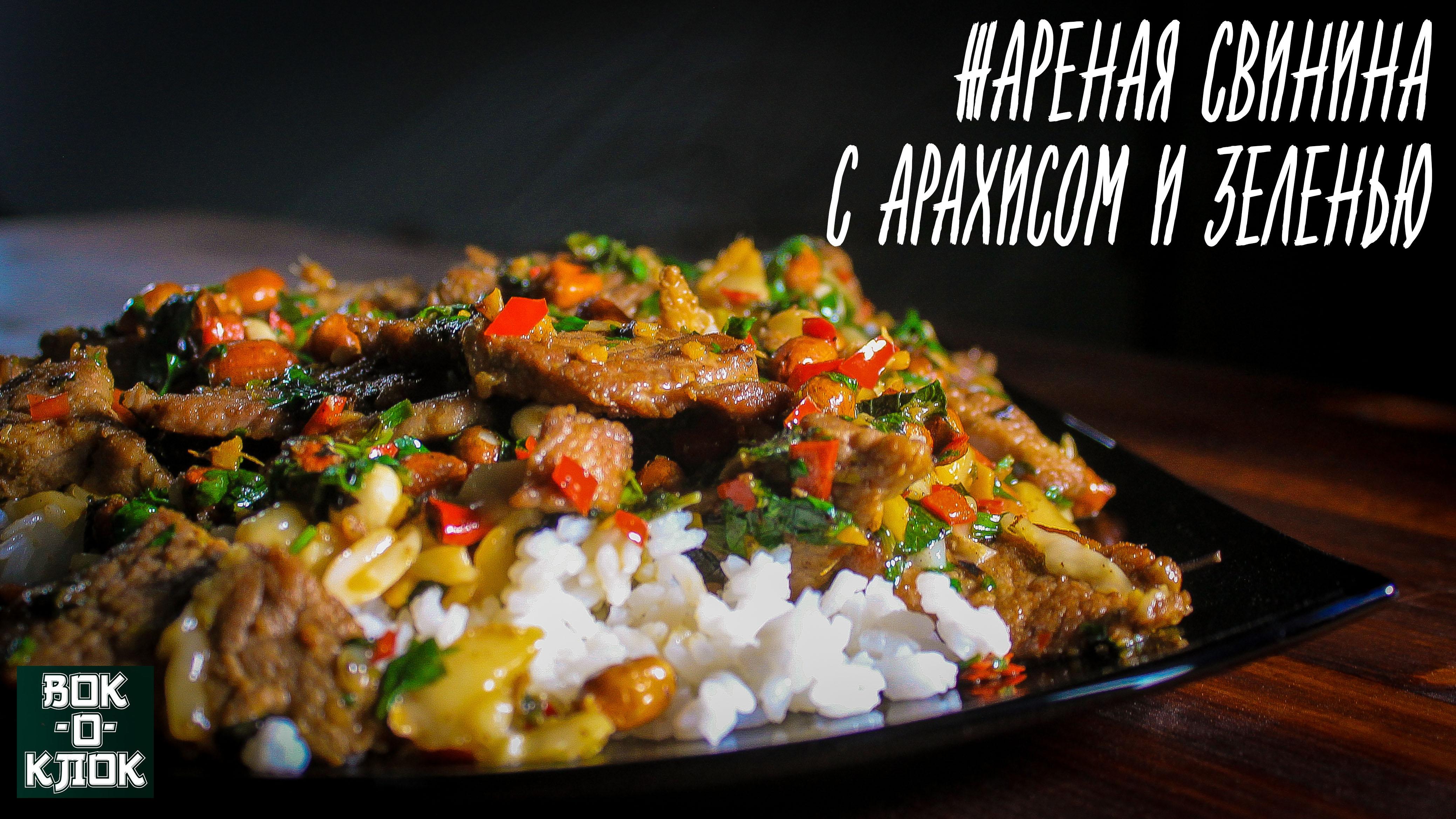 Убираем свинину вместе с жидкостью в отдельную ёмкость. Снова нагреваем вок, смазываем остатками масла, добавляем зелёный лук, имбирь, чеснок и чили. Обжариваем до появления устойчивого аромата, добавляем арахис и обжариваем 1-2 минуты.