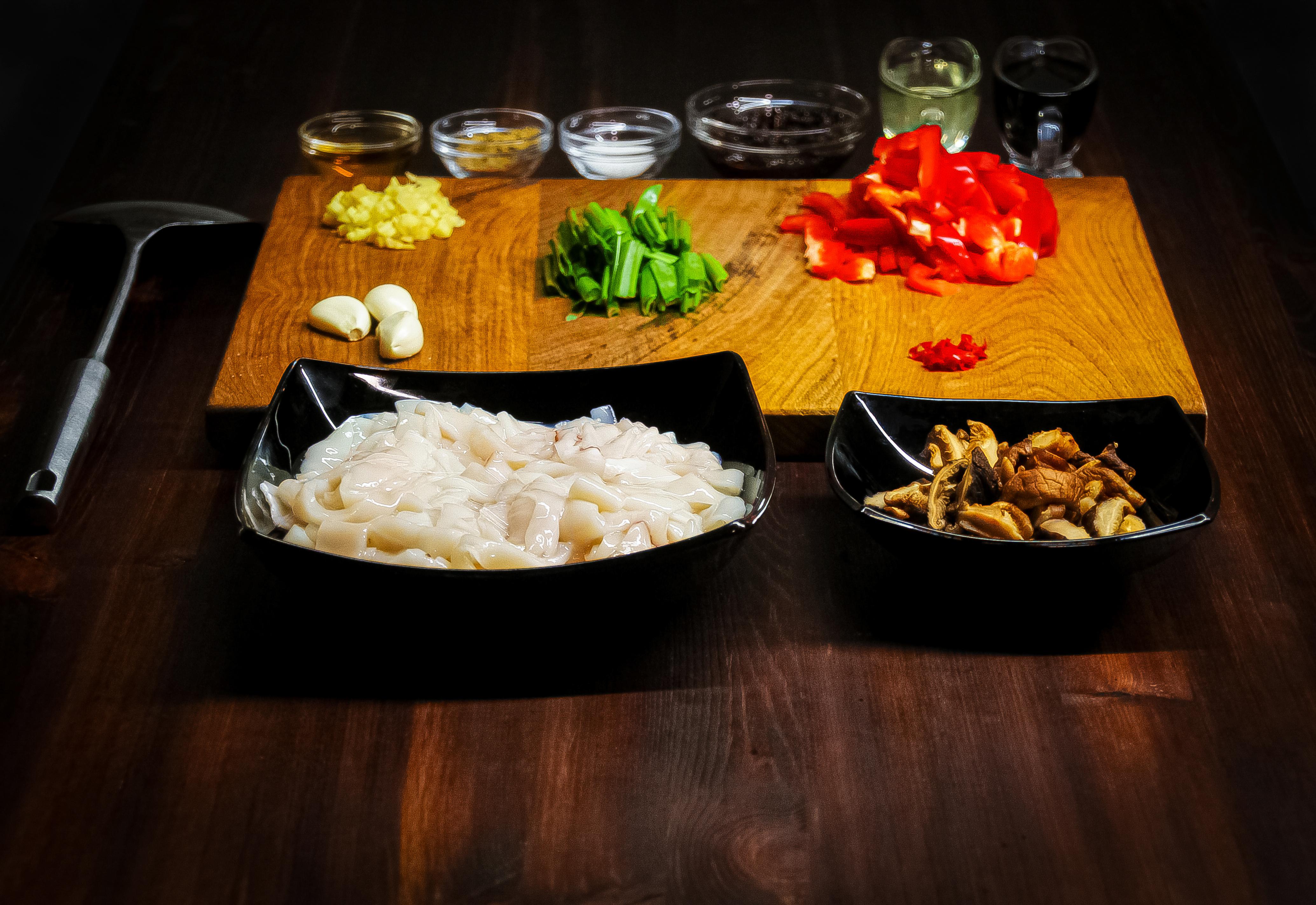 Смазываем вок маслом и хорошо разогреваем. Добавляем кальмара и быстро обжариваем при постоянном помешивании, секунд 30. После этого вынимаем кальмара из сковороды.