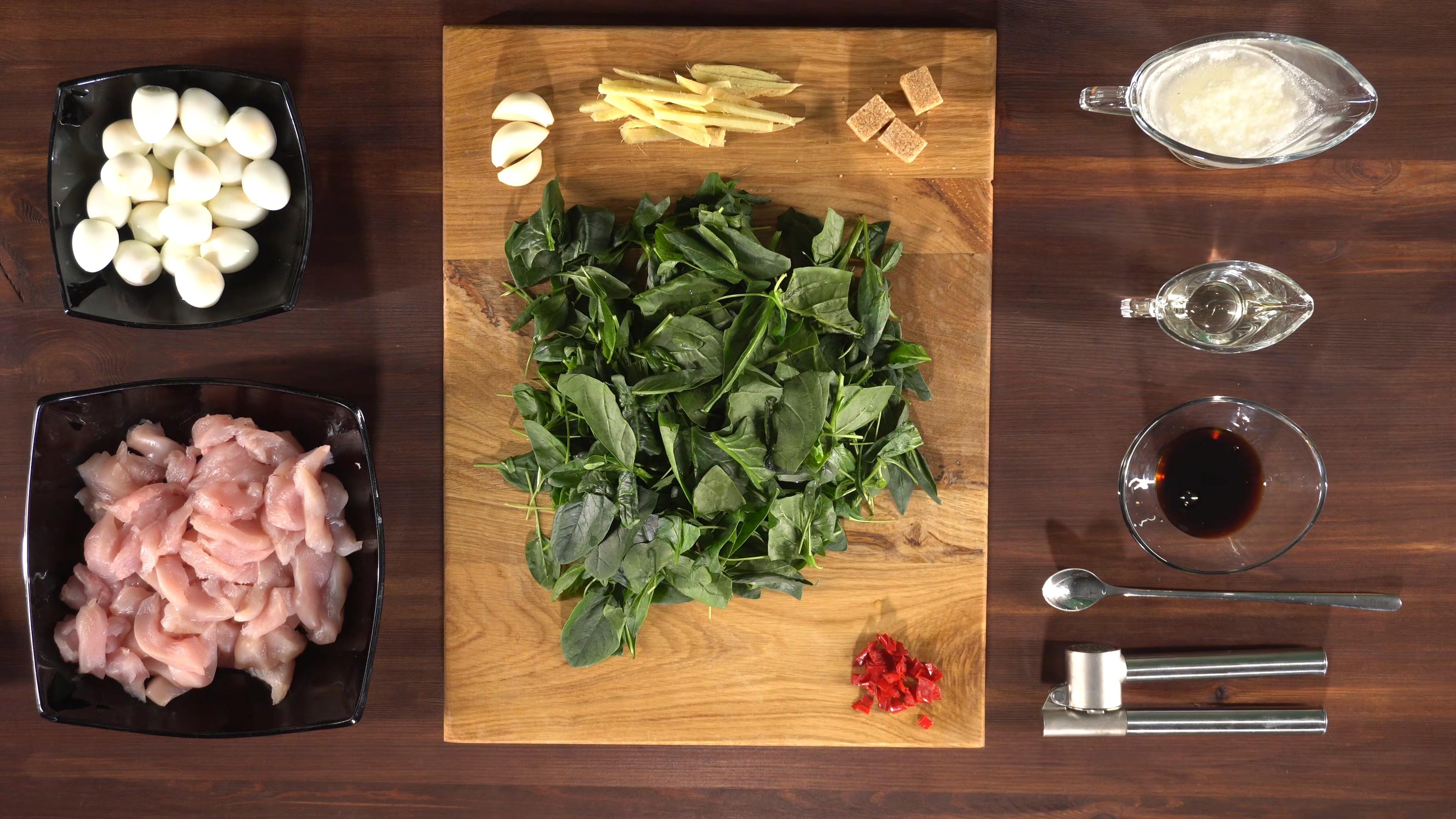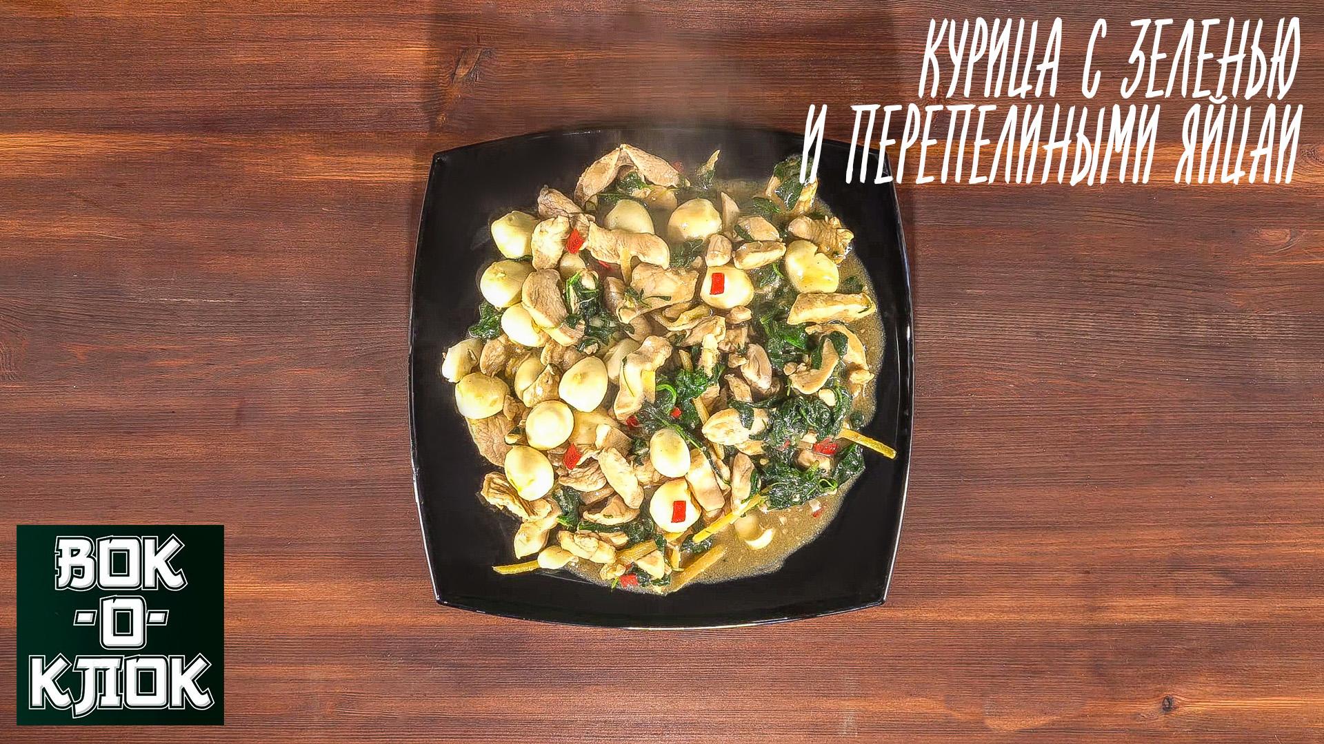Когда курица стала выглядеть готовой, добавьте шпинат, быстро перемешайте, затем добавьте яйца, чили и устричный соус. Если смесь выглядит суховатой – можно капнуть немного кипячёной воды. Убавьте огонь до среднего, накройте вок крышкой и готовьте 1-2 минуты.